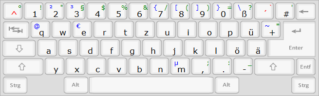 Wygląd niemieckiej klawiatury w wydaniu QWERTZ. Jak używać polskich znaków na niemieckiej klawiaturze, dowiesz się TUTAJ.