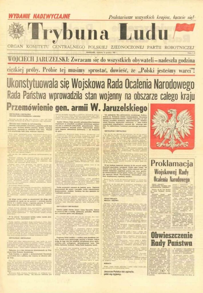Wielki jest ciężar odpowiedzialności, jaka spada na mnie w tym dramatycznym momencie polskiej historii. Obowiązkiem moim jest wziąć tę odpowiedzialność - chodzi o przyszłość Polski, o którą moje pokolenie walczyło na wszystkich frontach wojny i której oddało najlepsze lata swego życia. Ogłaszam, że w dniu dzisiejszym ukonstytuowała się Wojskowa Rada Ocalenia Narodowego. Rada Państwa, w zgodzie z postanowieniami Konstytucji, wprowadziła dziś o północy stan wojenny na obszarze całego kraju. Chcę, aby wszyscy zrozumieli motywy i cele naszego działania. Nie zmierzamy do wojskowego zamachu, do wojskowej dyktatury. Naród ma w sobie dość siły, dość mądrości, aby rozwinąć sprawny, demokratyczny system socjalistycznych rządów. W takim systemie siły zbrojne będą mogły pozostawać tam, gdzie jest ich miejsce - w koszarach. Żadnego z polskich problemów nie można na dłuższą metę rozwiązać przemocą. Wojskowa Rada Ocalenia Narodowego nie zastępuje konstytucyjnych organów władzy. Jej jedynym zadaniem jest ochrona porządku prawnego w państwie, stworzenie gwarancji wykonawczych, które umożliwią przywrócenie ładu i dyscypliny. To ostatnia droga, aby zapoczątkować wychodzenie kraju z kryzysu, uratować państwo przed rozpadem. Komitet Obrony Kraju powołał pełnomocników-komisarzy wojskowych na wszystkich szczeblach administracji państwowej oraz w niektórych jednostkach gospodarczych. Pełnomocnicy-komisarze otrzymali prawo nadzorowania działalności organów administracji państwowej - od ministerstw do gmin.